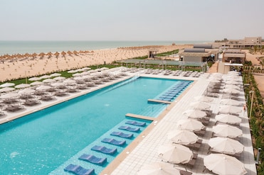 Luxury hotel boasts 4 outdoor pools and a free water park with waterslide. Swim up to the bar, lounge under umbrellas, or watch children splash in their pool.